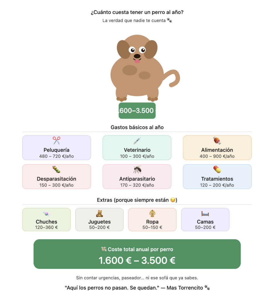 Pongamos un ejemplo real: un perro bien cuidado, con sus rutinas, su salud al día… y algún capricho (como todos 😅).