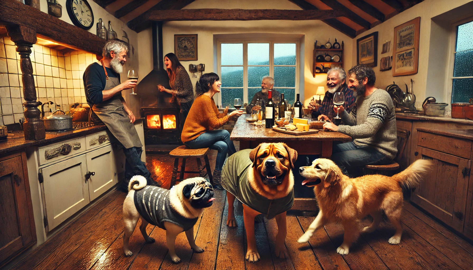 La lluvia no daba tregua. Desde las ventanas de la cocina, se veía cómo las gotas golpeaban con fuerza los cristales. Nuestros perros estaban algo inquietos por no poder salir al jardín, especialmente Markos, que siempre necesita acción. Manuela, en cambio, estaba feliz en su esquina favorita junto al fuego. Aristóteles, fiel a su nombre, estaba sentado dignamente en una silla como si fuera un invitado más, observando todo con esa seriedad absurda que solo los carlinos pueden tener.